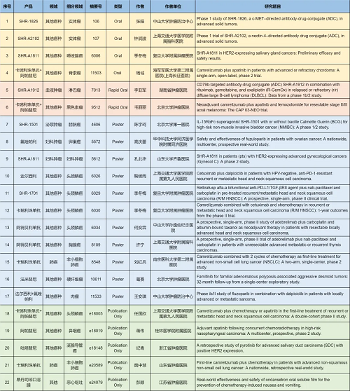 在肺癌、妇科肿瘤、淋巴瘤、膀胱癌、头颈肿瘤、黑色素瘤、肉瘤、鼻咽癌、脊索瘤、唾液腺癌、胸腺癌、硬纤维瘤、涎腺导管癌等其他多个疾病领域,卡瑞利珠单抗、阿帕替尼、阿得贝利单抗、吡咯替尼、达尔西利、氟唑帕利、法米替尼、SHR-1501、瑞拉芙普-α(SHR-1701)、SHR-1826、瑞康曲妥珠单抗(SHR-A1811)、SHR-A1912、SHR-A2102等抗肿瘤创新药相关研究一共入选了4项口头报告、2项快速口头报告、11项壁报展示和4项线上发表,彰显了DB真人医药强劲的研发实力。此外,昂丹司琼口溶膜在防治化疗导致的恶心呕吐方面展现出了良好的疗效,本次ASCO年会有1项研究线上发表。